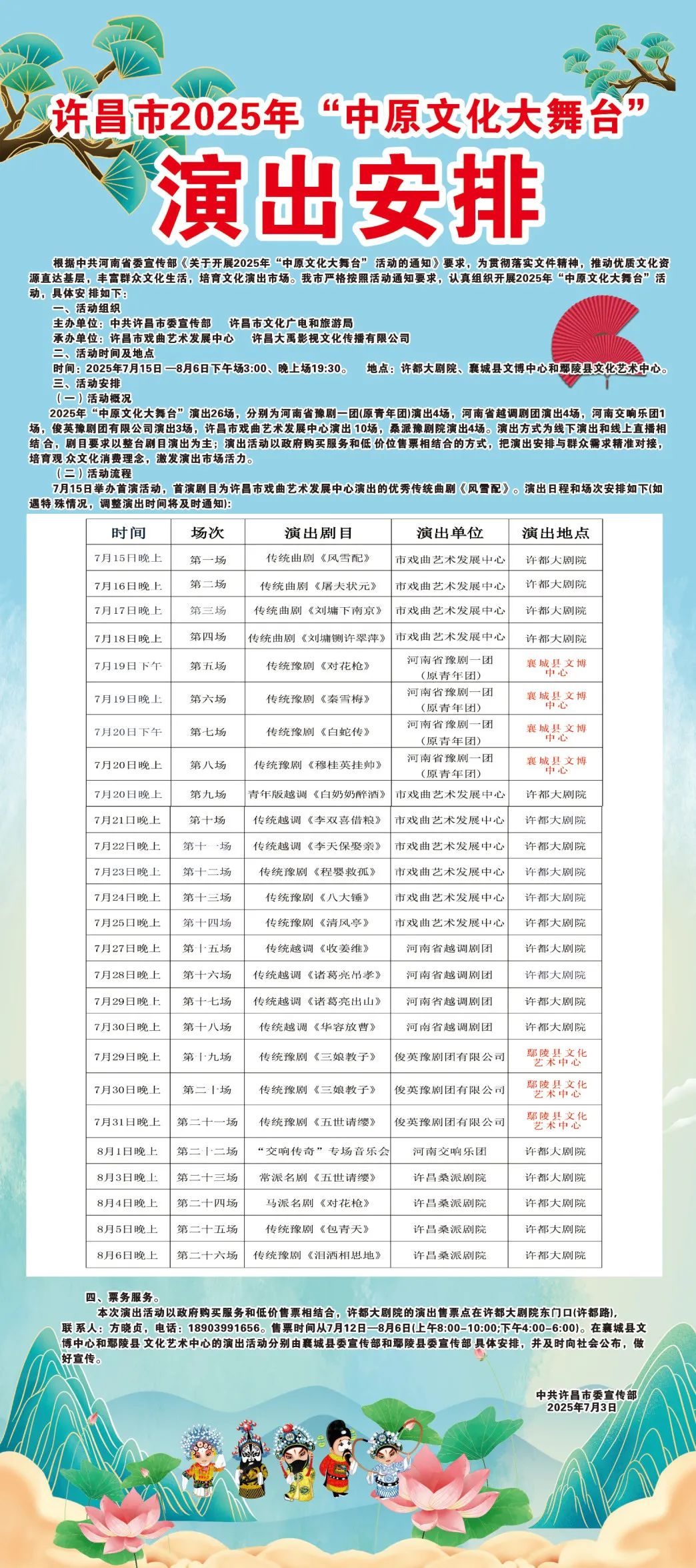 许昌市2025年“中原文化大舞台”演出活动由市委宣传部、市文广旅局主办,演出时间为7月15日至8月6日下午场15:00、晚上场19:30,演出场次共26场,分别为河南省豫剧一团(原青年团)演出4场,河南省越调剧团演出4场,河南交响乐团1场,俊英豫剧团有限公司演出3场,许昌市戏曲艺术发展中心演出10场,桑派豫剧院演出4场。