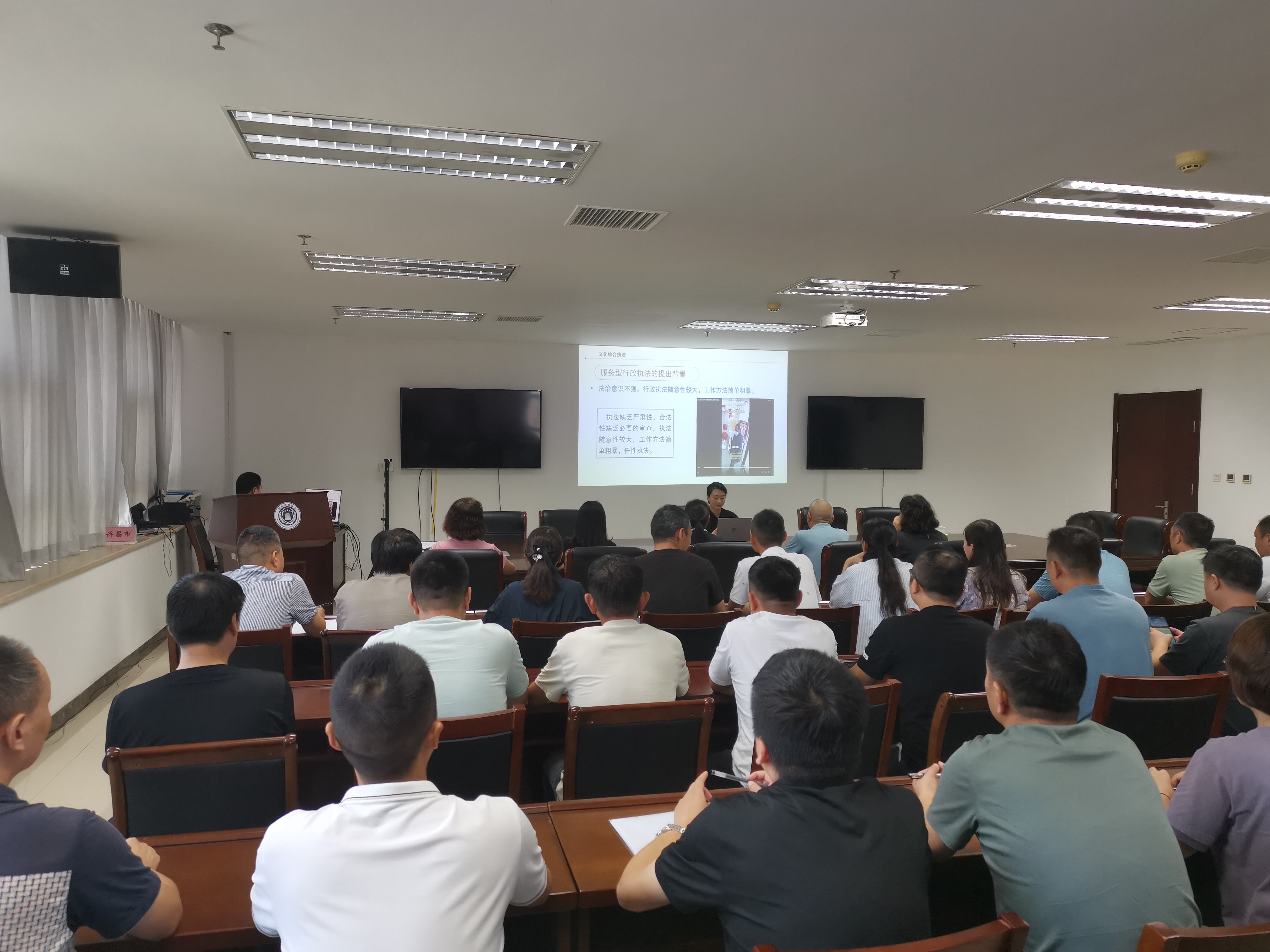 本次宣讲由许昌市第一批服务型行政执法授课员、东城区大队大队长董聪从同志以《践行服务型行政执法 彰显执法温度》为题进行授课,围绕“服务型行政执法背景”、“服务型行政执法本质要求”、以及“在执法中如何落实服务型行政执法”三个方面,深入浅出地讲解服务型行政执法的概念、特点,同时对讲解行政指导、行政调解、行政相对人法律风险防控、落实“放管服”改革要求等内容进行宣讲,使执法人员进一步转变执法理念、充实业务知识、拓宽工作思路,加深对服务型行政执法的理解和认识。