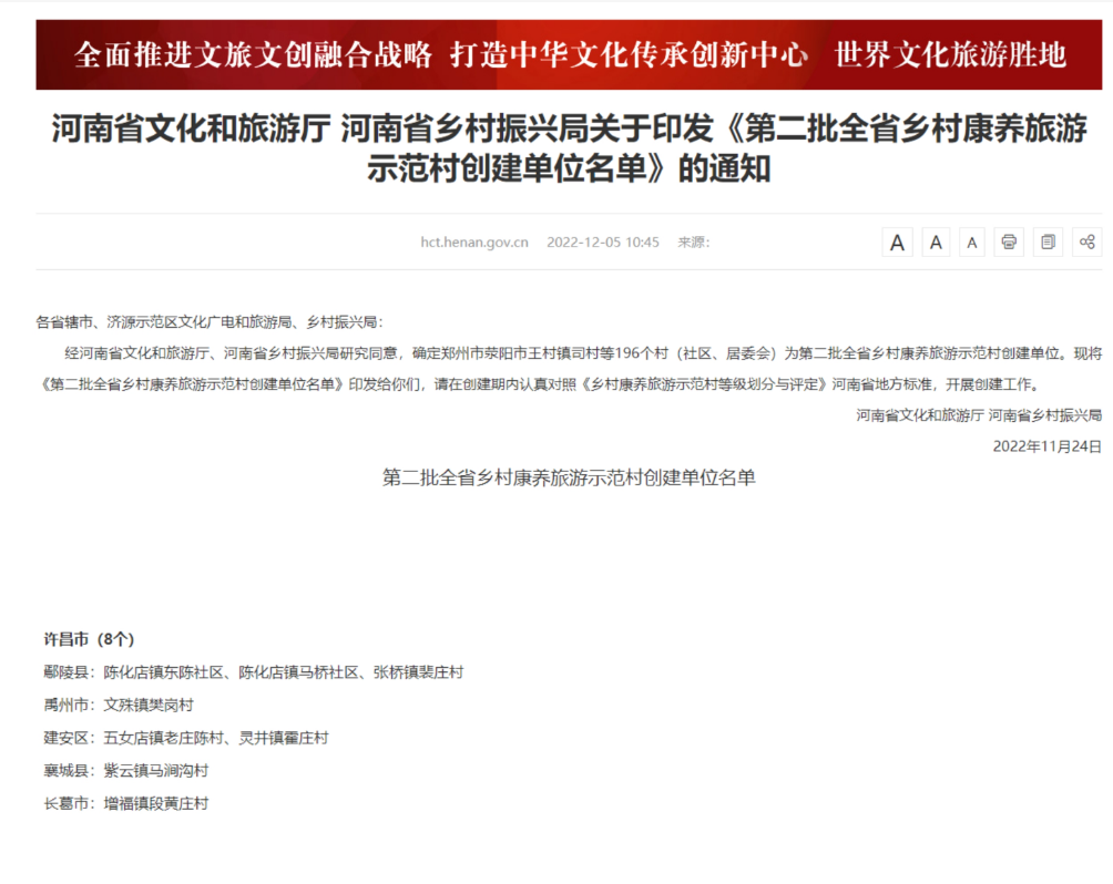 11月24日,河南省文化和旅游厅、河南省乡村振兴局公布了第二批河南省乡村康养旅游示范村创建单位名单,我市8个村(社区)入选。分别为鄢陵县陈化店镇东陈社区、陈化店镇马桥社区、张桥镇裴庄村,禹州市文殊镇樊岗村,建安区五女店镇老庄陈村、灵井镇霍庄村,襄城县紫云镇马涧沟村,长葛市增福镇段黄庄村。